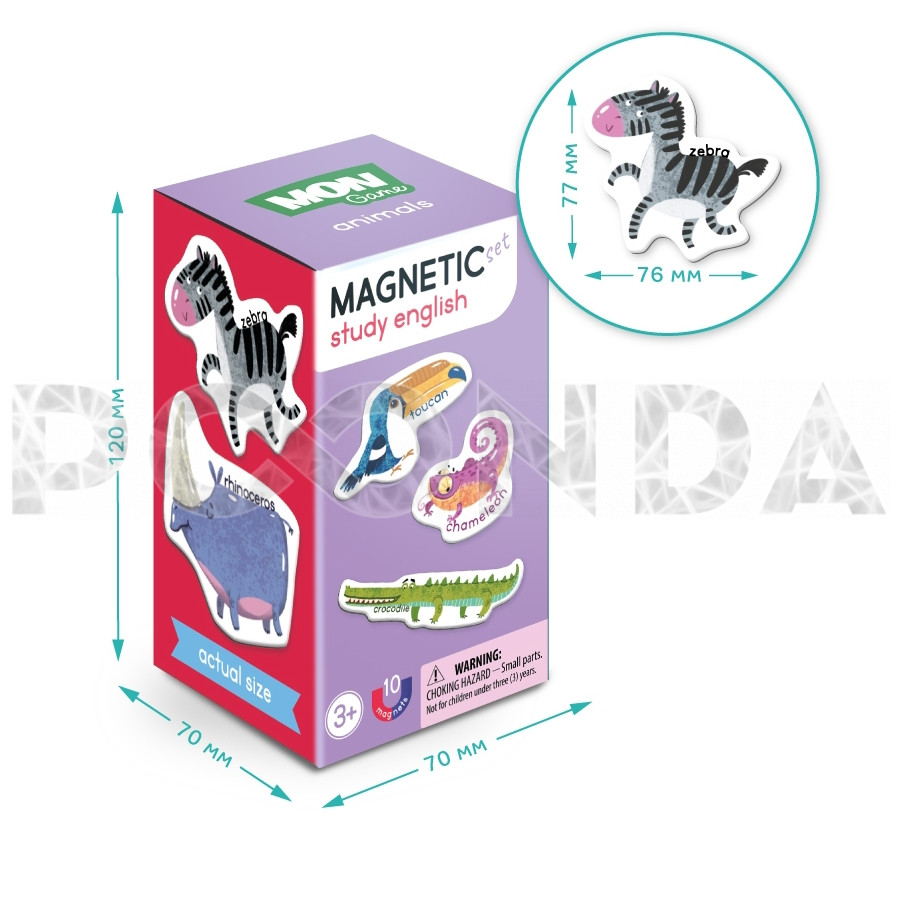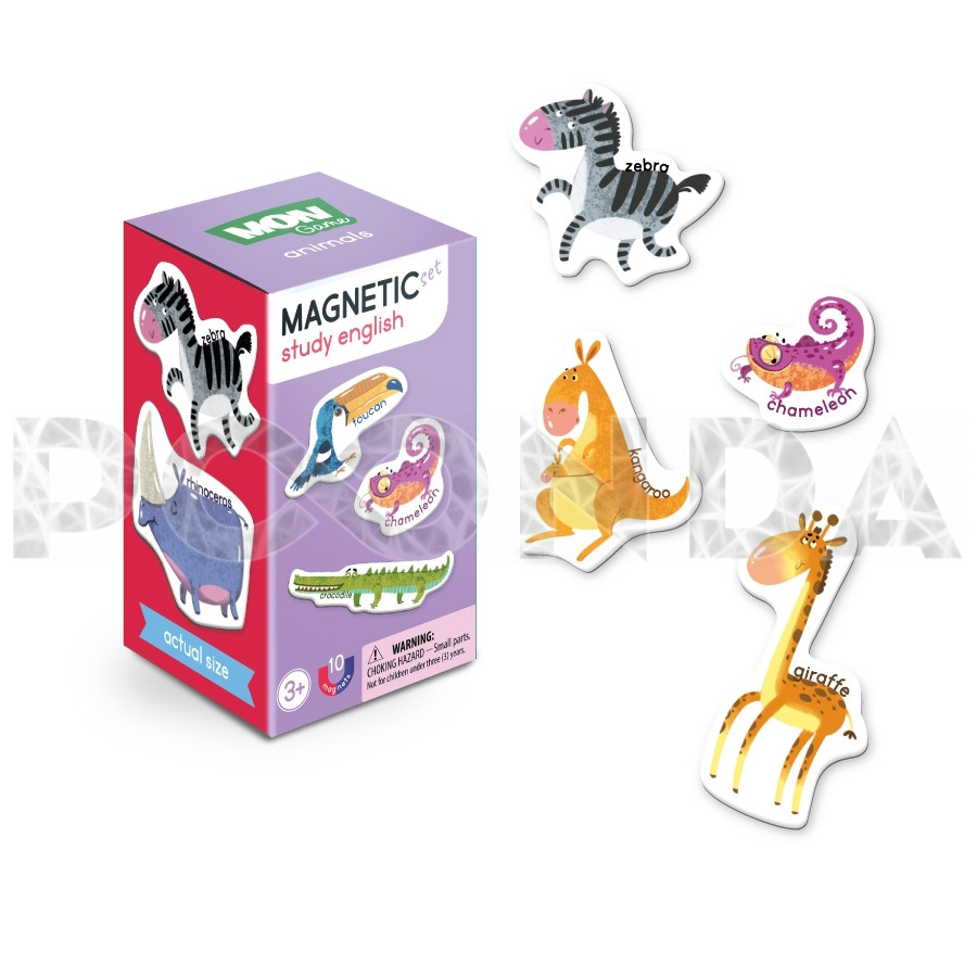 На каждом магнитике изображается яркое животное и его название на английском.