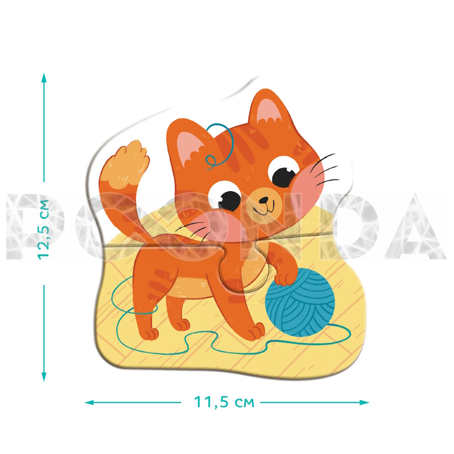 В комплекте 4 отдельные пазлы с разным количеством деталей (от 2 до 4 элементов) — игривый котенок,