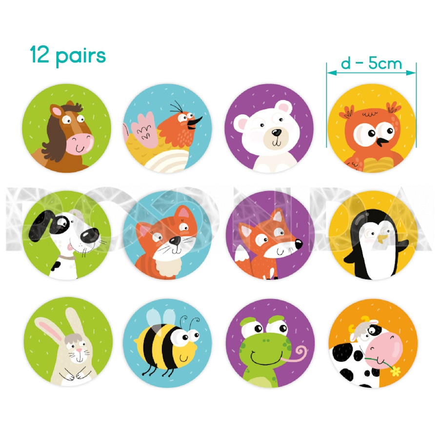 В наборе 24 фишки (12 пар) с изображениями милых животных. Каждая фишка диаметром 5 см удобно
