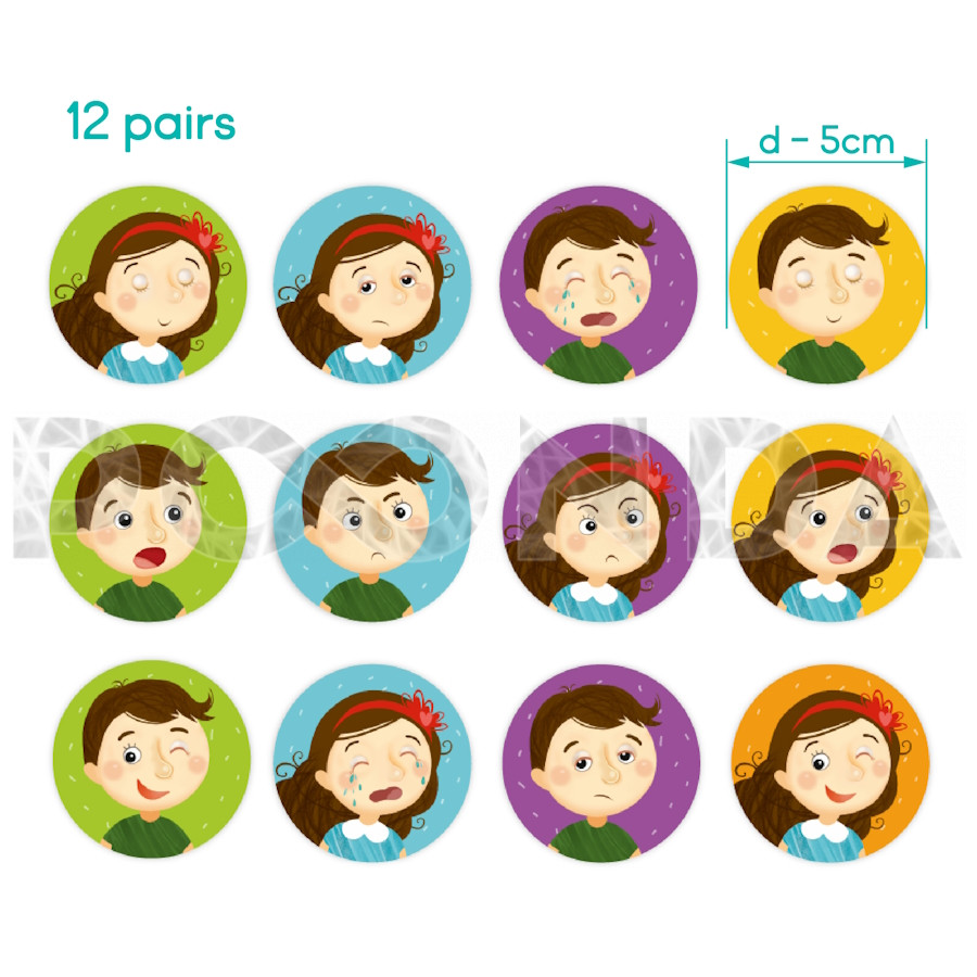 В наборе 24 фишки (12 пар) диаметром 5 см с изображениями разных эмоций –